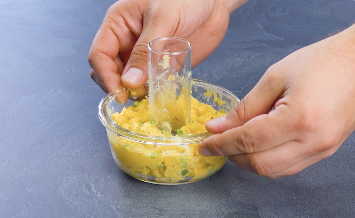 1.2 Stelle ein Schnapsglas in ein kleines Glasschälchen und fülle die Mac and Cheese etwa 3 cm hoch um das Schnapsglas herum in das Schälchen. Friere alles eine Stunde ein.