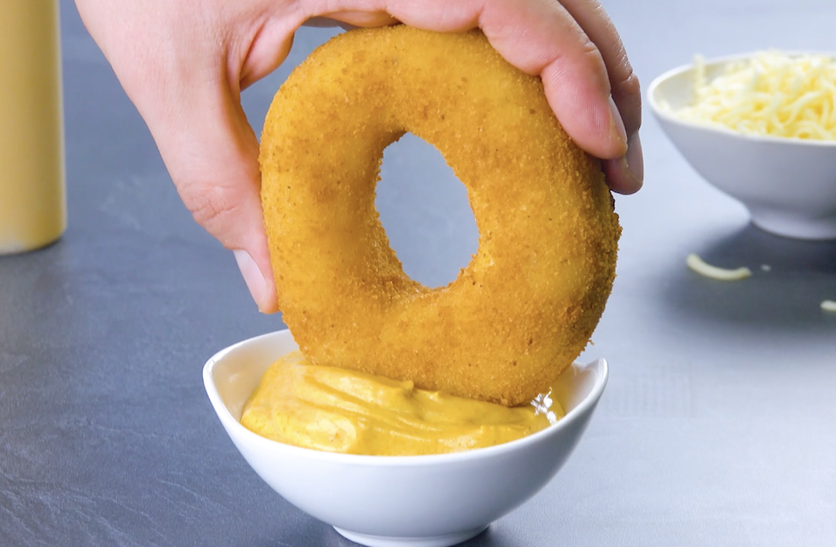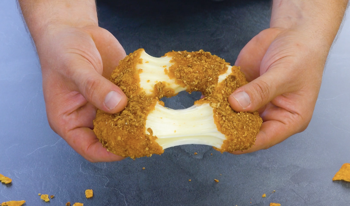 3.3 Wende den fest gewordenen Käse-Ring ringsum in Mehl, dann in Ei und dann in zerkleinerten Doritos. Frittiere den Käse-Donut bei 160 °C für ca. 3 Minuten in heißem Fett.