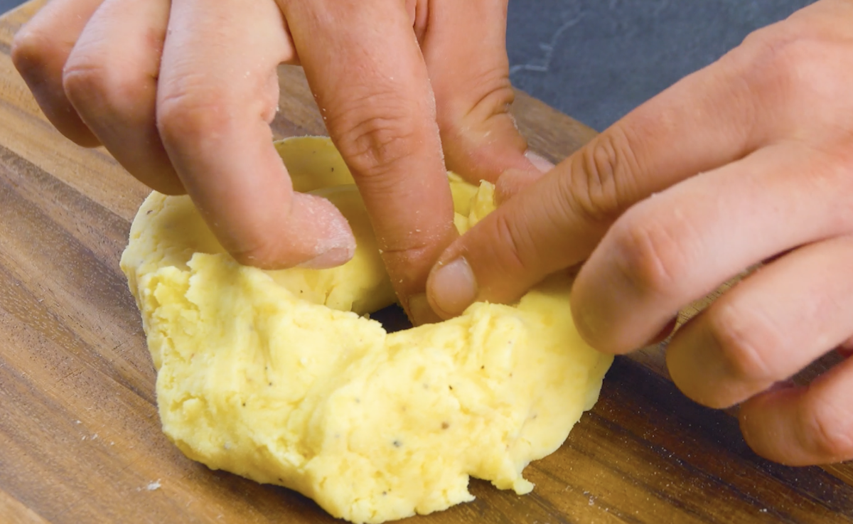 2.1 Koche die Kartoffeln, bis sie weich sind, und lasse sie ausdampfen. Zerstampfe sie dann zu einem sämigen Brei und gib Stärke, Salz, Pfeffer und Muskat hinzu.