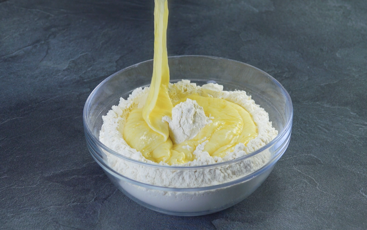 3.2 Gib Mehl in eine Schüssel und forme darin eine ringförmige Vertiefung. Gib den geschmolzenen Käse in diese Vertiefung und friere die Schüssel samt Käse für eine Stunde ein.