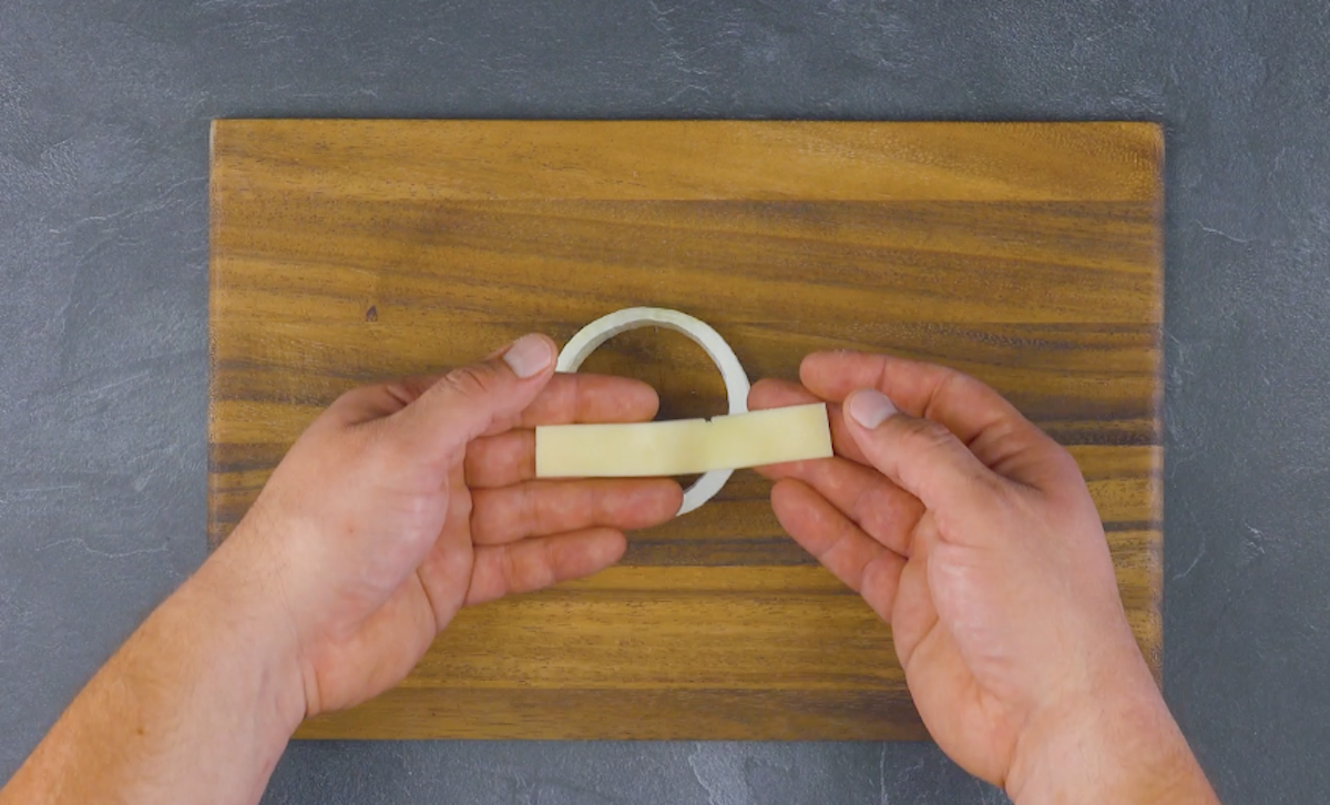 2.2 Schneide aus der Zwiebelmitte eine ca. 2 cm dicke Scheibe ab und löse ihren inneren Teil heraus. Lege dann zwei Streifen Käse an die Innenwand des verbliebenen Zwiebelrings.