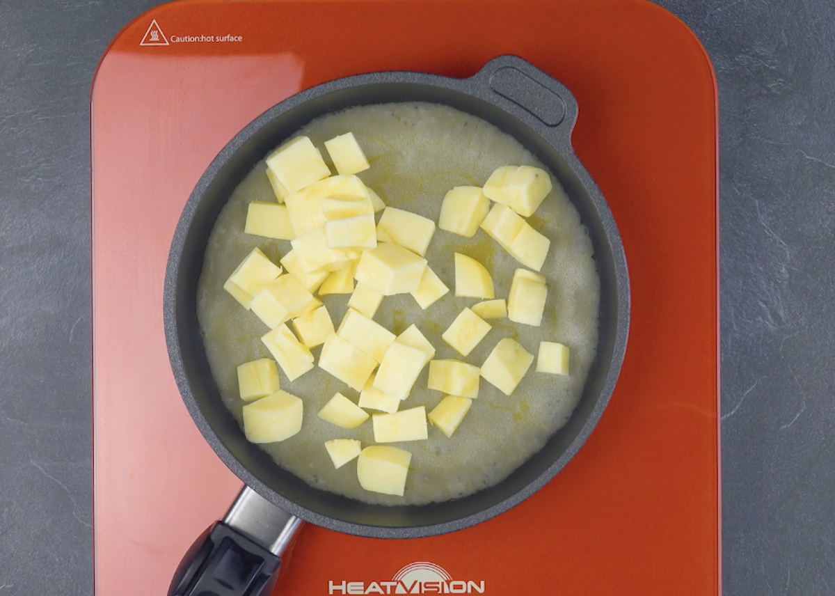3.1 Schneide den Käse in grobe Stücke, gib diese in eine beschichtete Pfanne und lasse sie bei kleiner Hitze schmelzen.