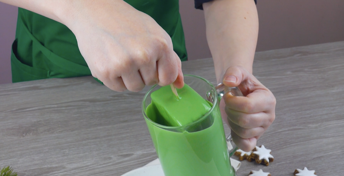 1.2 Temperiere die weiße Schokolade, fülle 5 EL davon in einen kleinen Spritzbeutel und färbe den Rest mit grüner Lebensmittelfarbe ein. Tunke anschließend die Kuchenstücke am Stiel in die grüne Kuvertüre.