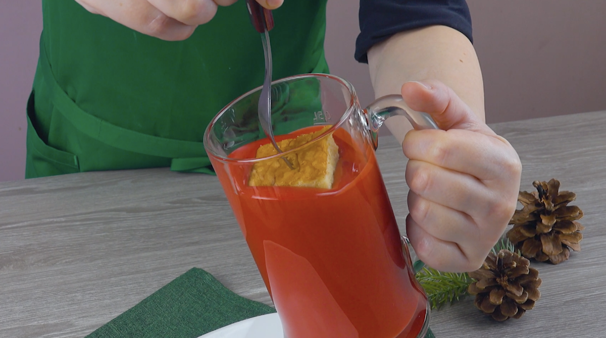 2.2 Spieße die Kuchenquadrate auf eine Gabel und tunke sie in die rote Kuvertüre.