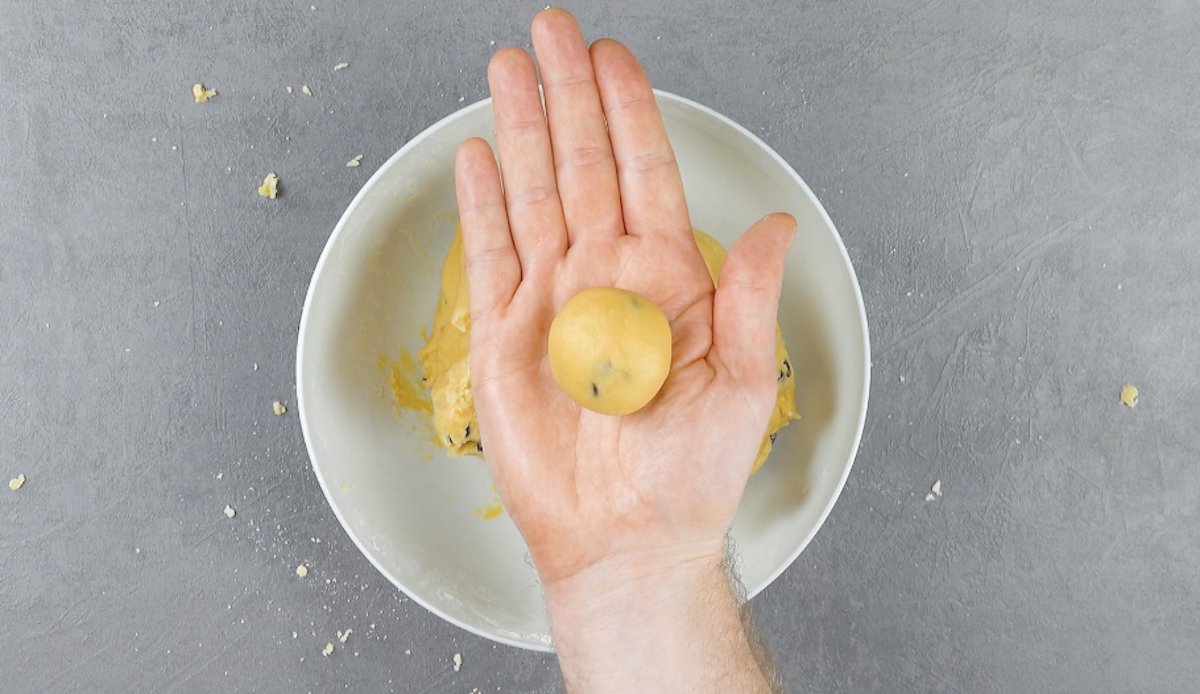 1.1 Drehe eine Muffinform auf den Kopf und fette sie leicht ein. Forme aus dem Teig kleine Kugeln.