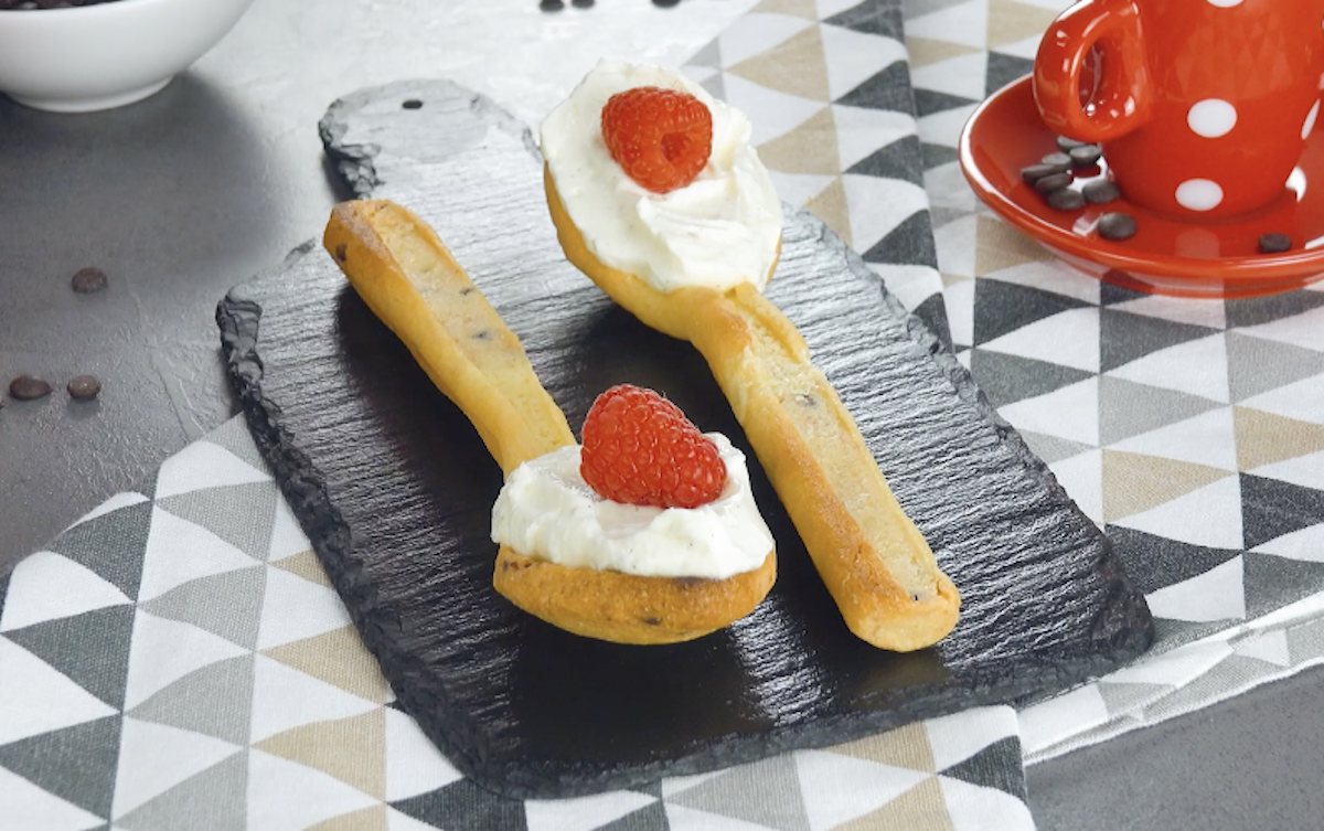 3.5 Schiebe das Blech bei 180 °C Ober- und Unterhitze für 30 Minuten in den Ofen. Entferne nach dem Backen die Löffel, solange die Cookie-Löffel noch lauwarm sind (sei vorsichtig, damit die Löffel nicht brechen). Lasse die Löffel komplett auskühlen und fülle dann Creme auf den vorderen Teil. Garniere die Creme noch mit frischen Himbeeren.