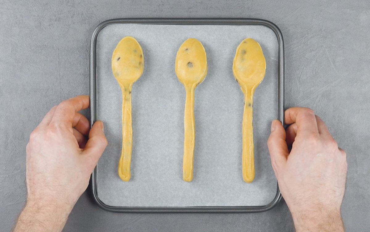 3.4 Nimm den oberen Löffel vorsichtig herunter und lege den Cookie-Löffel (samt unterem Löffel) auf ein Backblech mit Backpapier. Wiederhole alles mit dem restlichen Teig und lasse dann alles gut durchkühlen.