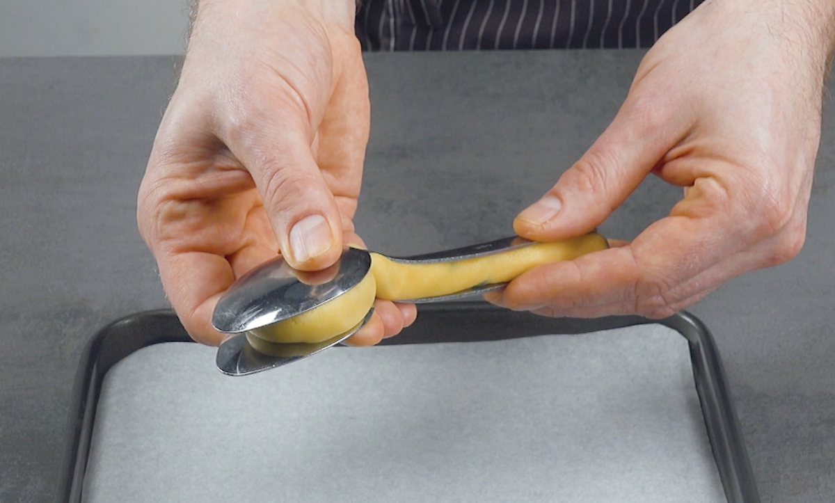 3.3 Lege einen weiteren (eingefetteten) Löffel auf den Teig und drücke beide Löffel zusammen, sodass dazwischen ein Löffel aus Cookie-Teig entsteht. Hilf an den Rändern mit deinen Fingern nach.