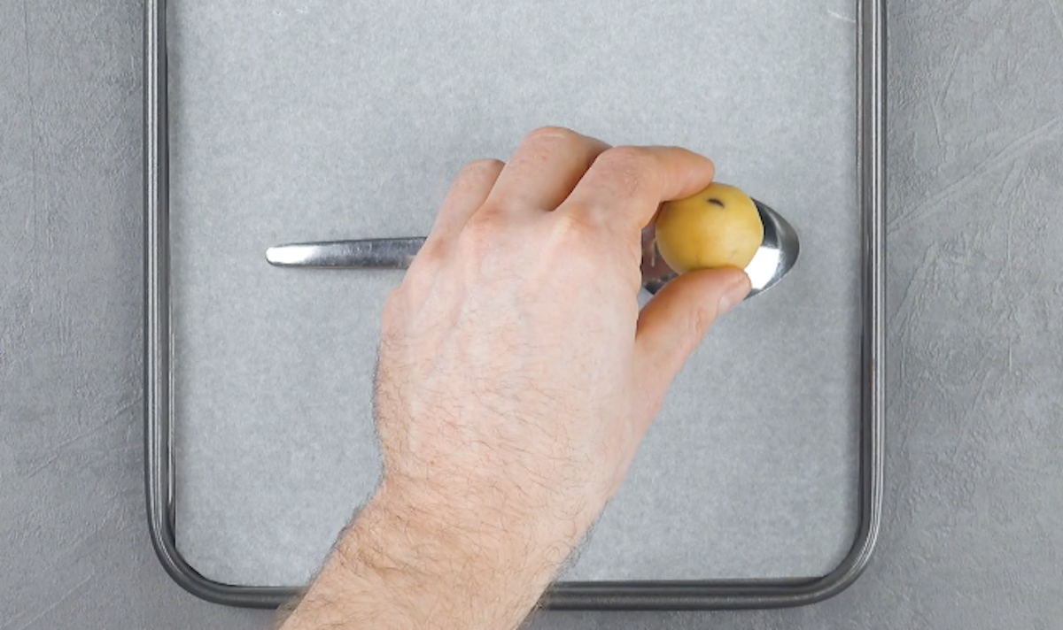 3.1 Fette einen Löffel leicht ein. Rolle dann ein Teigstück zu einer Kugel und lege diese auf das vordere Ende des umgedrehten Löffels.