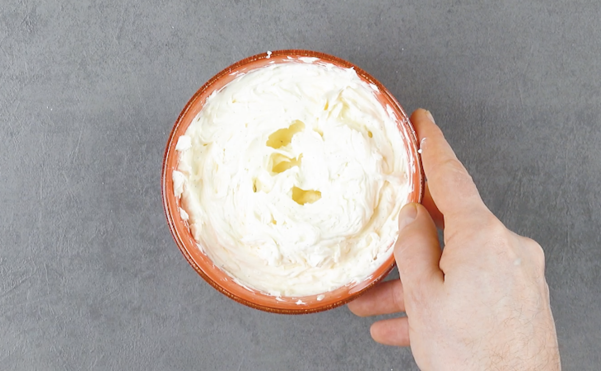 B. Für die Creme gibst du Frischkäse mit dem Mark einer Vanilleschote, Puderzucker und dem Saft einer halben Zitrone in eine Schüssel. Schlage alles zusammen auf, bis eine cremige Konsistenz entstanden ist. Für die Röllchen füllst du die Creme in einen Spritzbeutel, für die beiden anderen Rezepte nicht.