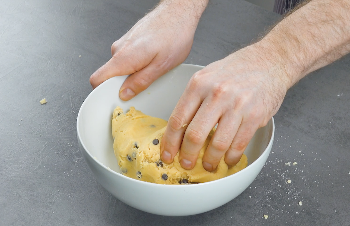 A. Vermenge alle Teigzutaten miteinander und verknete sie zu einem Teig. Kühle den Teig rund 30 Minuten.