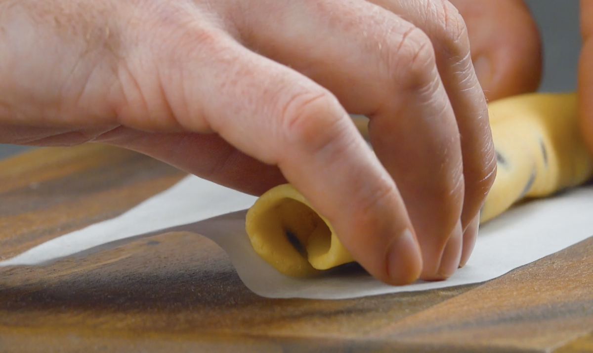 2.1 Forme aus dem Cookie-Teig dünne Röllchen (erst ausrollen, dann aufrollen). Lass die Röllchen danach gut auskühlen.