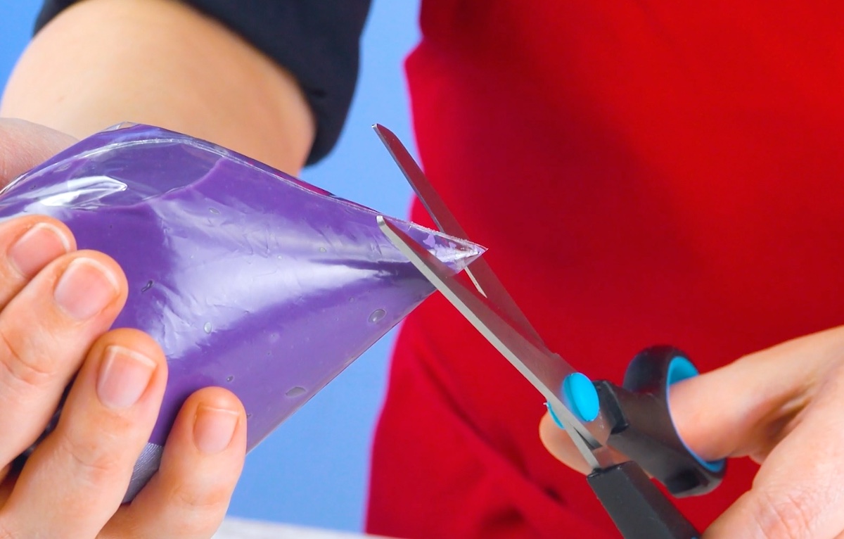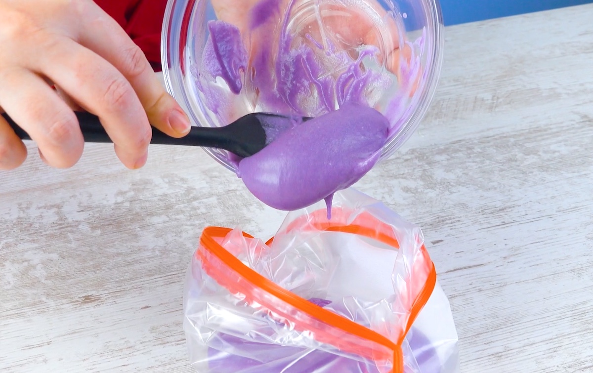 3.2 Teile die Masse gleichmäßig auf 6 Schüsseln auf und färbe jede Masse unterschiedlich ein. Fülle die gefärbten Massen dann in je einen wiederverschließbaren Beutel. Schneide dann bei jedem Beutel eine der unteren Ecken ab.