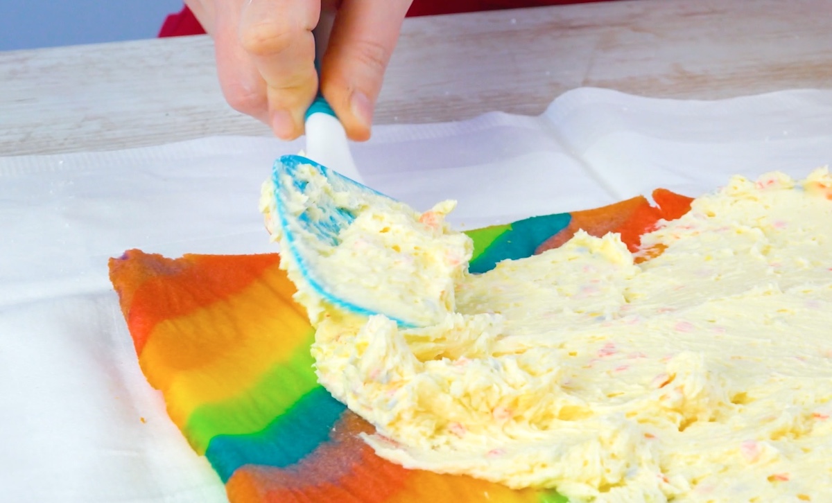 2.5 Rolle den abgekühlten Biskuit wieder aus und bestreiche ihn vorsichtig mit der Buttercreme; lass auf einer Seite einen Rand frei.