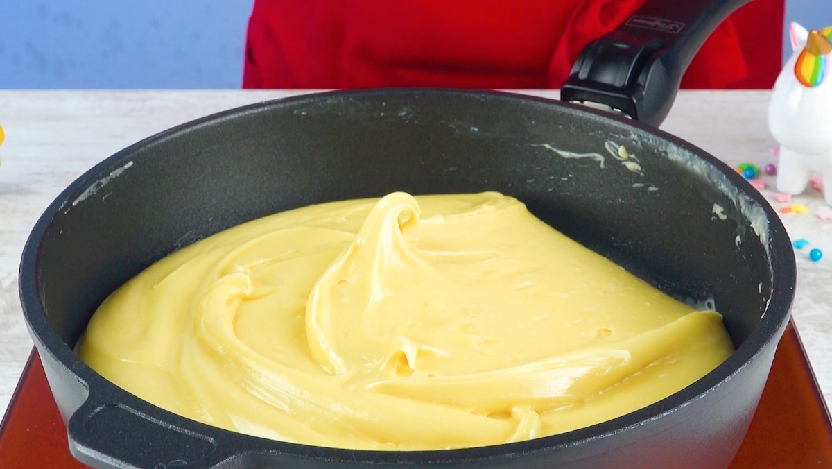 3.3 Lege die Innenseiten der Kuchenform mit Backpapier aus. Fülle die bunten Massen nun nacheinander in die Form. Wir empfehlen, die Massen spiralförmig in die Form zu geben und dann glatt zu streichen, bevor die nächste Masse kommt. Mit dieser Technik wird jede Schicht ungefähr gleich dick und das Vermischen der Massen wird vermieden.