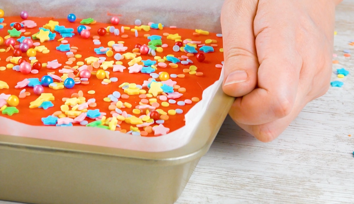 3.4 Bedecke die oberste Schicht mit einem Stück Backpapier und drücke sie zum Beispiel mit einem Brett oder einer ähnlich großen Form platt. Entferne dann das Backpapier wieder und bestreue die letzte Schicht mit Zuckerdekor. Stelle die Form dann für mindestens 3 Stunden in den Kühlschrank.