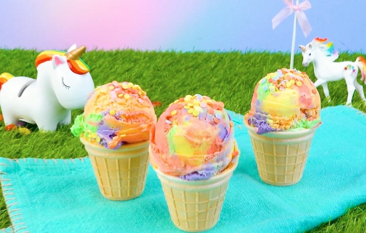 1.4 Richte dein selbstgemachtes Regenbogen-Eis in Schüsseln oder Eiswaffeln an, garniere es mit Streuseln und genieße den fruchtig-süßen Geschmack.