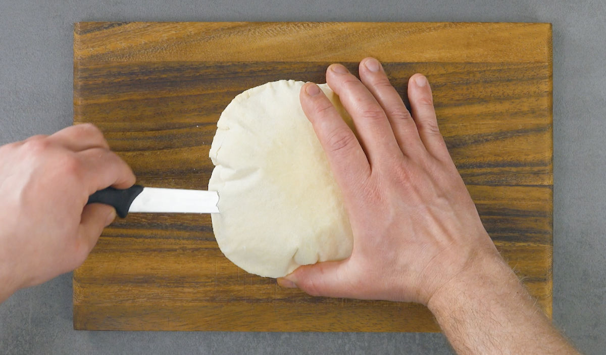 4. Backe die Fladen bei 250 °C Umluft für 3 Minuten im Ofen. Wenn die Fladen sich aufgebläht haben, hole sie aus dem Ofen heraus. Schneide die aufgeblähten Fladen seitlich ein und ziehe sie dann ein bisschen auseinander.