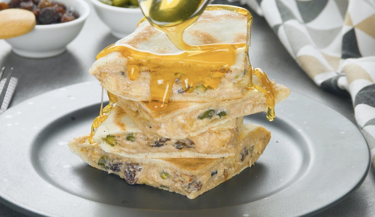 8. Für die süße Füllung schneidest du Bananen klein und vermengst sie mit Frischkäse, Pekannüssen, Pistazien, Rosinen, Honig und Zimt. Fülle alles in die letzten drei Fladen und backe sie von beiden Seiten in der Crêpepfanne goldbraun an.