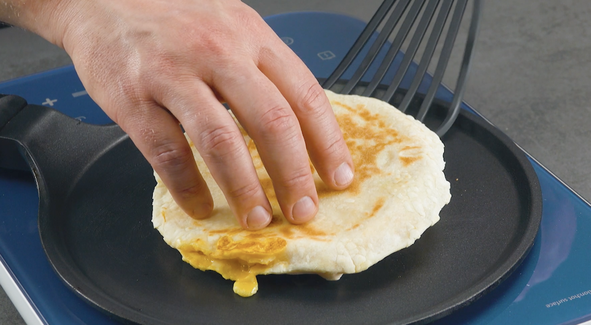 5. Kommen wir nun zu den drei verschiedenen Füllungen. Für Füllung 1 gibst du Eier mit Lauchzwiebeln, Tomaten und Käse in eine Schüssel und vermengst alles miteinander. Fülle die Rührei-Mischung in drei der Fladen. Lege die gefüllten Fladen vorsichtig in eine heiße Crêpepfanne und backe sie von beiden Seiten 3 bis 4 Minuten bis sie goldbraun sind.
