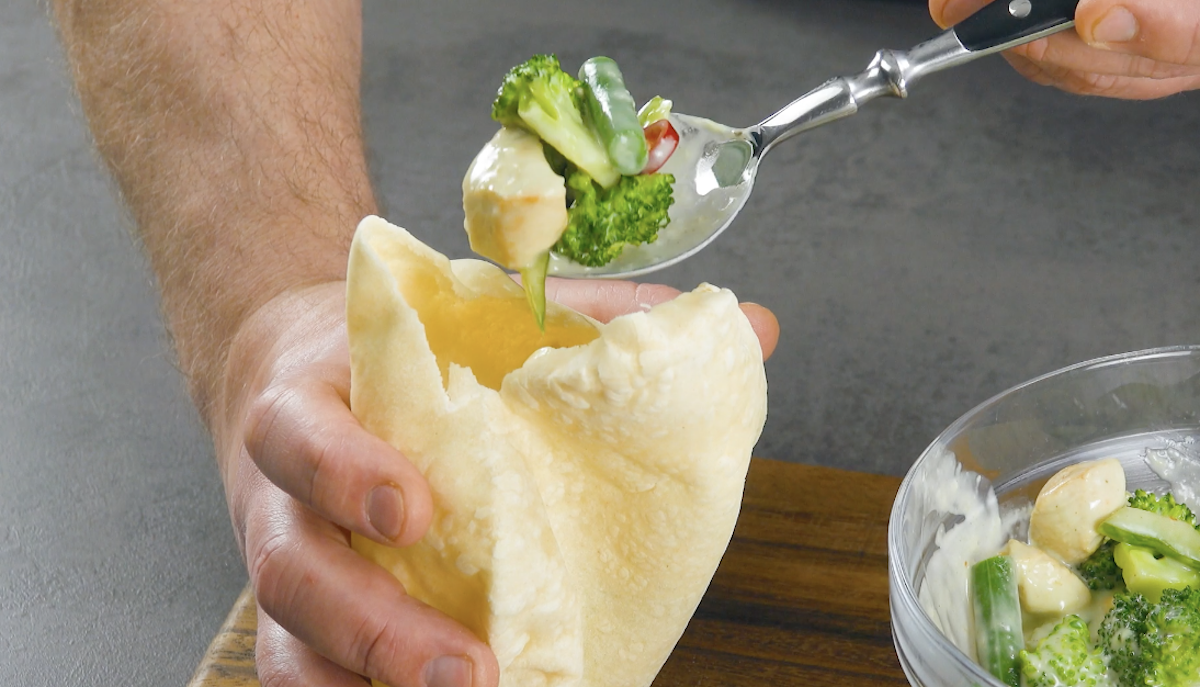 6. Für Füllung 2 schneidest du Hähnchenbrust klein und brätst sie scharf an. Gib Brokkoli, Bohnen und Paprika hinzu und brate alles kurz mit an. Gib Kokosmilch und Currypaste hinzu und koche alles zusammen auf. Binde mit Stärke ab und gib zum Schluss klein geschnittene Chili hinzu. Fülle alles in drei der Fladen und backe sie in der Crêpepfanne erneut von beiden Seiten goldbraun an.