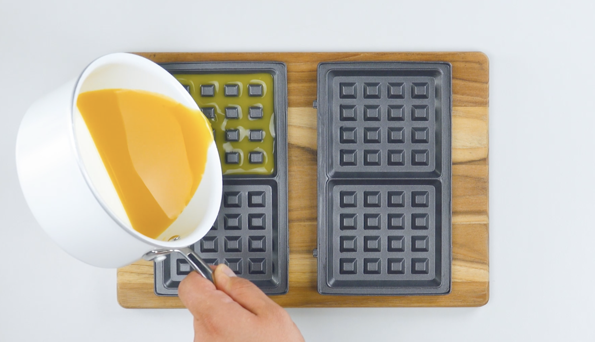 3.2 Entferne die Waffelbleche vom Waffeleisen und lege sie vor dich auf die Arbeitsfläche. Befülle beide Waffelbleche mit der orangefarbenen Flüssigkeit und stelle sie dann für 4 Stunden in den Kühlschrank.