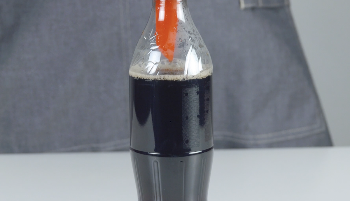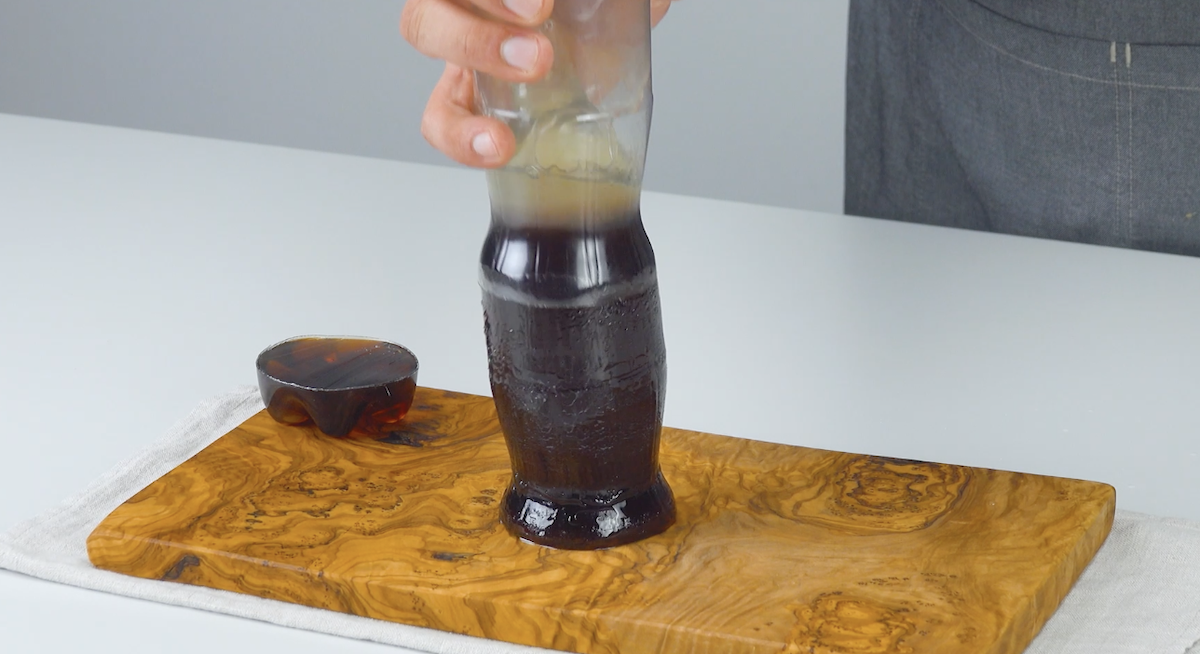 2.3 Schneide die Flasche mit einem Messer vorsichtig auf und entferne sie behutsam vom fest gewordenen Cola-Wackelpudding.