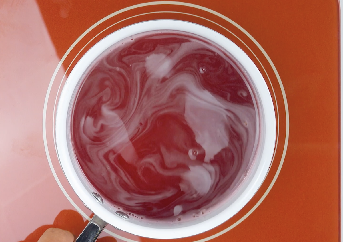 1.1 Gib eine Packung rotes Jello mit 300 ml Wasser und Zucker zusammen in einen Topf. Füge Gelatine hinzu und erwärme den Topf langsam, bis sich alles aufgelöst hat.