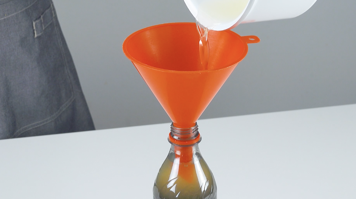 2.1 Gib 400 ml Cola in einen Topf und füge 20 g Gelatine hinzu. Lass die Gelatine ca. 5 Min quellen und erwärme dann alles langsam, bis sich die Gelatine aufgelöst hat. Fülle dann mithilfe eines Messbechers oder eines Trichters die Cola wieder zurück in die Flasche (Füllhöhe: wie auf dem folgenden Bild zu sehen). Stelle die Flasche dann für 30 Minuten in den Kühlschrank.