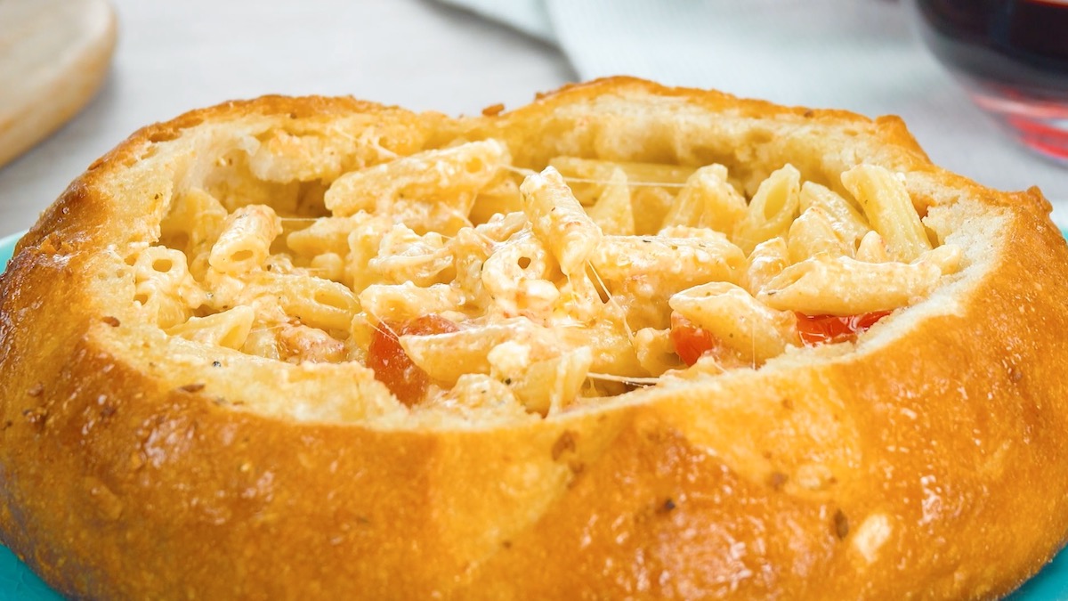 1.4 Nimm den Deckel vom Brot, fülle die gekochten Nudeln hinein und verrühre den Inhalt – fertig ist dein mit Tomaten, Feta und Nudeln gefülltes Brot.