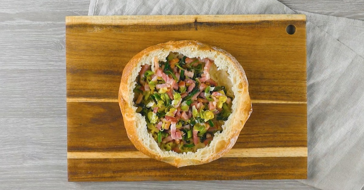 3.1 Schneide den Deckel vom Weißbrot ab und höhle es aus. Brate zunächst den Speck scharf an und gib dann den Lauch mit in die Pfanne. Fülle die Mischung dann in das Weißbrot.