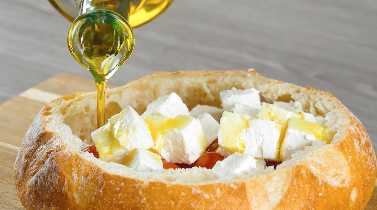 1.2 Fülle Tomaten und Feta in das Brot und verteile darüber Olivenöl, Oregano, Salz und Pfeffer.
