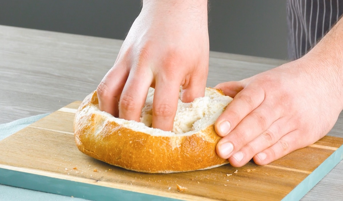 1.1 Schneide den Deckel vom Weißbrot ab und höhle es aus.
