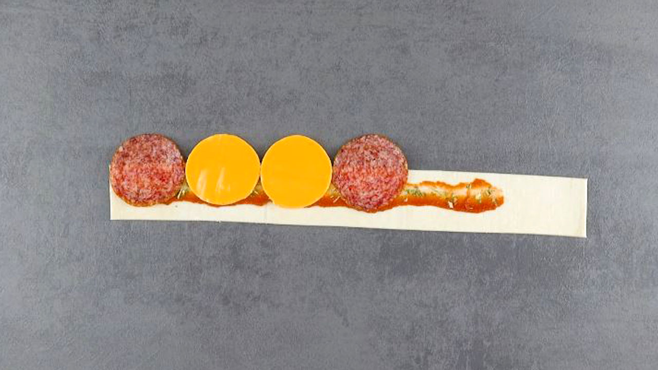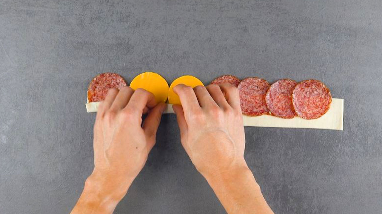2.3 Lege nun von links 1 Scheibe Salami, 2 Scheiben Käse und 4 weitere Salamischeiben auf die Streifen. Achte beim Belegen darauf, dass auch unten ein etwa 1 bis 2 cm breiter Rand frei bleibt.