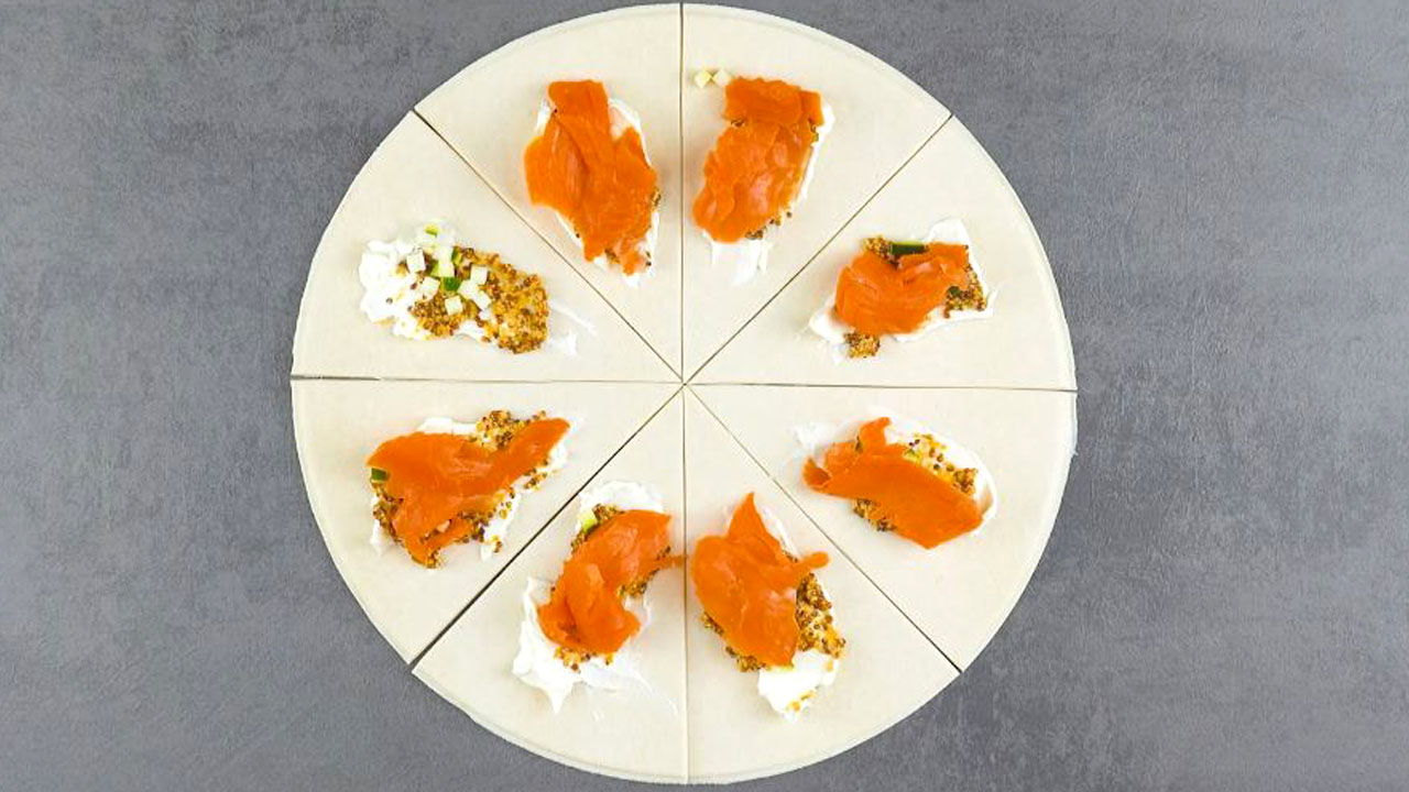 1.3 Bestreiche die einzelnen Stücke mit jeweils 1 EL Frischkäse und 1 TL Senf. Obendrauf kommen noch etwas gewürfelte Zucchini und Lachs.