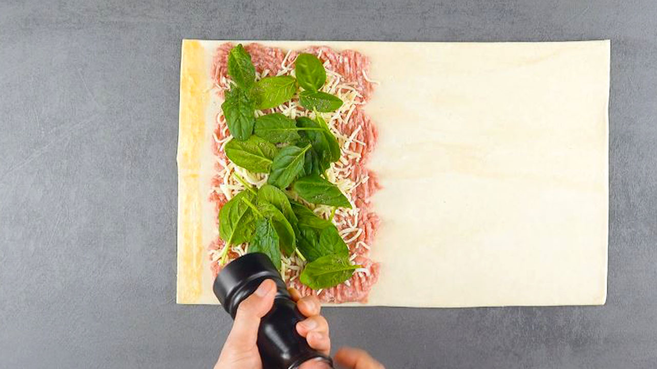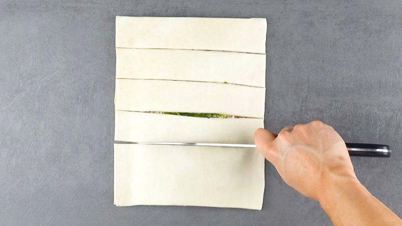 3.4 Klappe nun die rechte Hälfte des Blätterteigs nach links über die Wurst-Spinat-Füllung. Schneide den gefüllten Blätterteig danach mit einem Messer in 4 cm dicke Streifen.