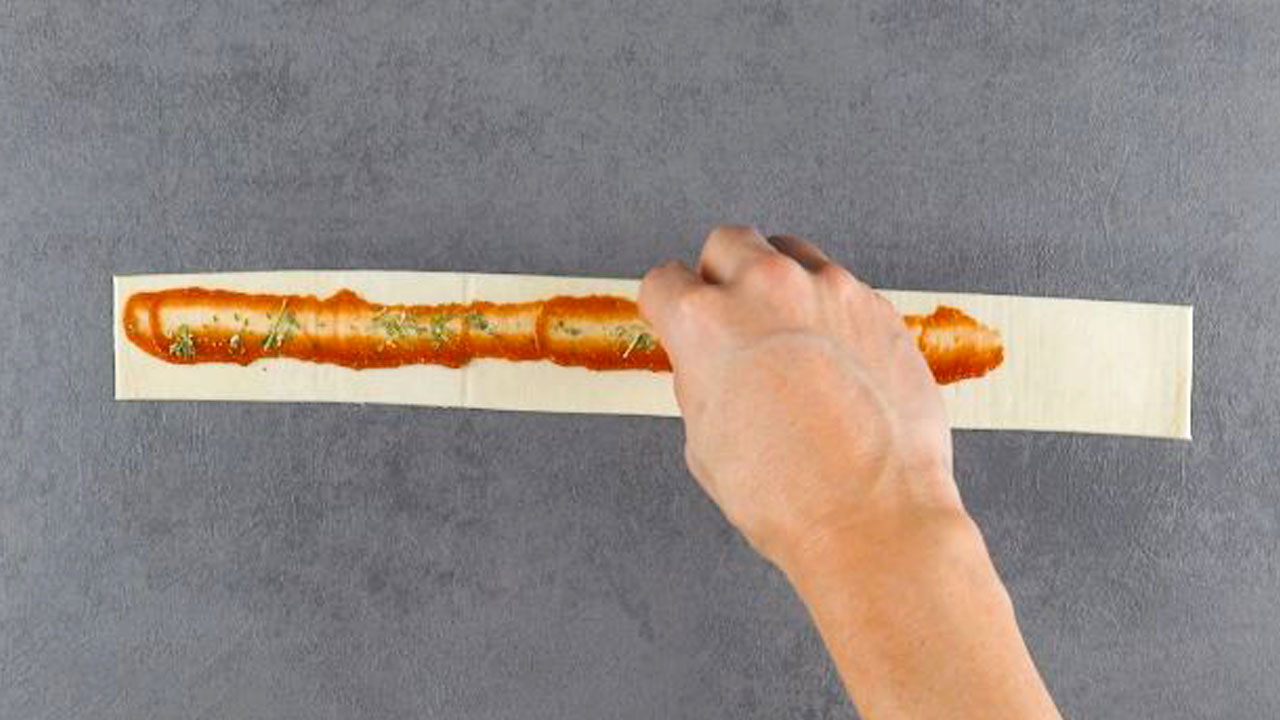 2.2 Bestreiche die Streifen jeweils mit Tomatenmark und gib ein wenig italienische Kräuter darauf. Lass ein etwa 2 cm breites Stück am rechten Ende der Streifen frei.