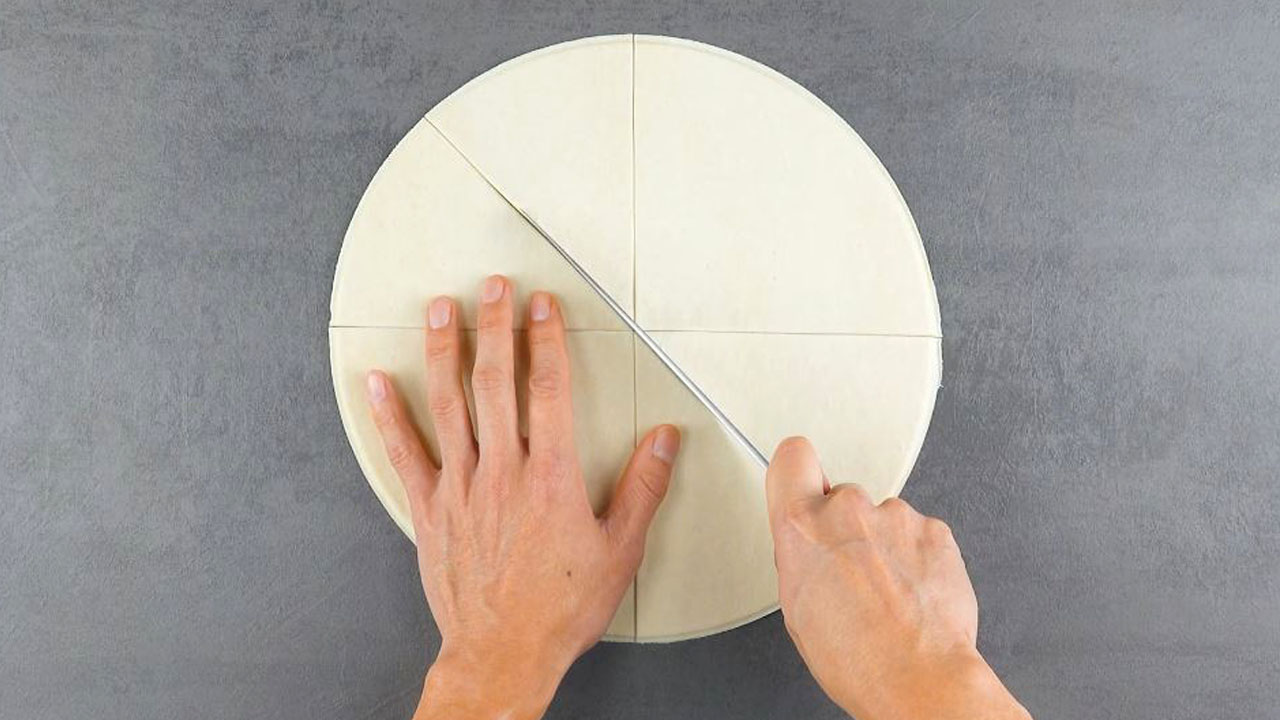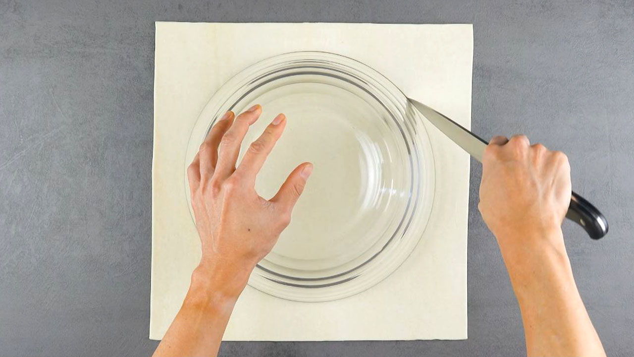1.1 Nimm dir eine große Schüssel und schneide mit ihrer Hilfe einen Kreis aus dem Blätterteig aus.