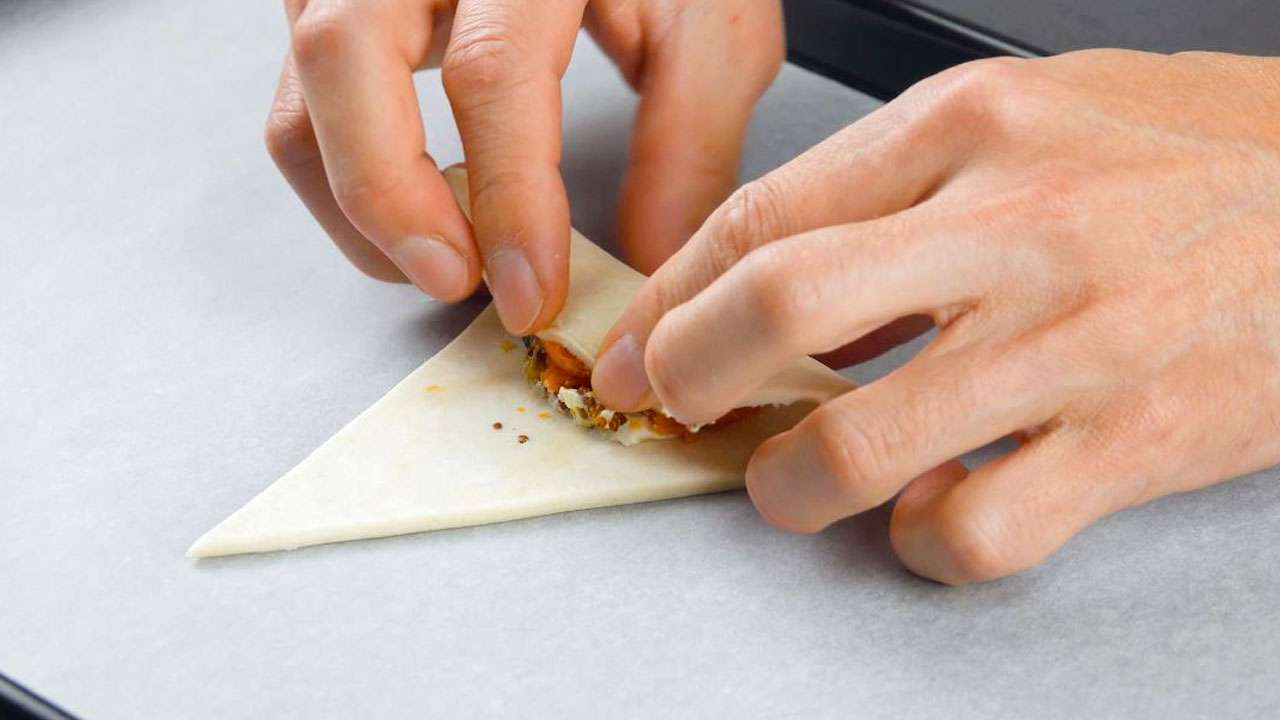1.4 Würze die Stücke nach Geschmack mit Pfeffer und Salz und rolle sie danach zu kleinen Croissants ein.