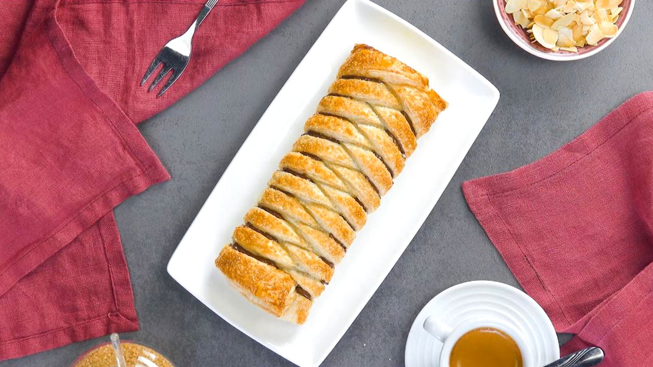4.3 Flicht danach die Teigstreifen abwechselnd über die Schokoladen-Bananen-Füllung zu einem Blätterteigzopf.