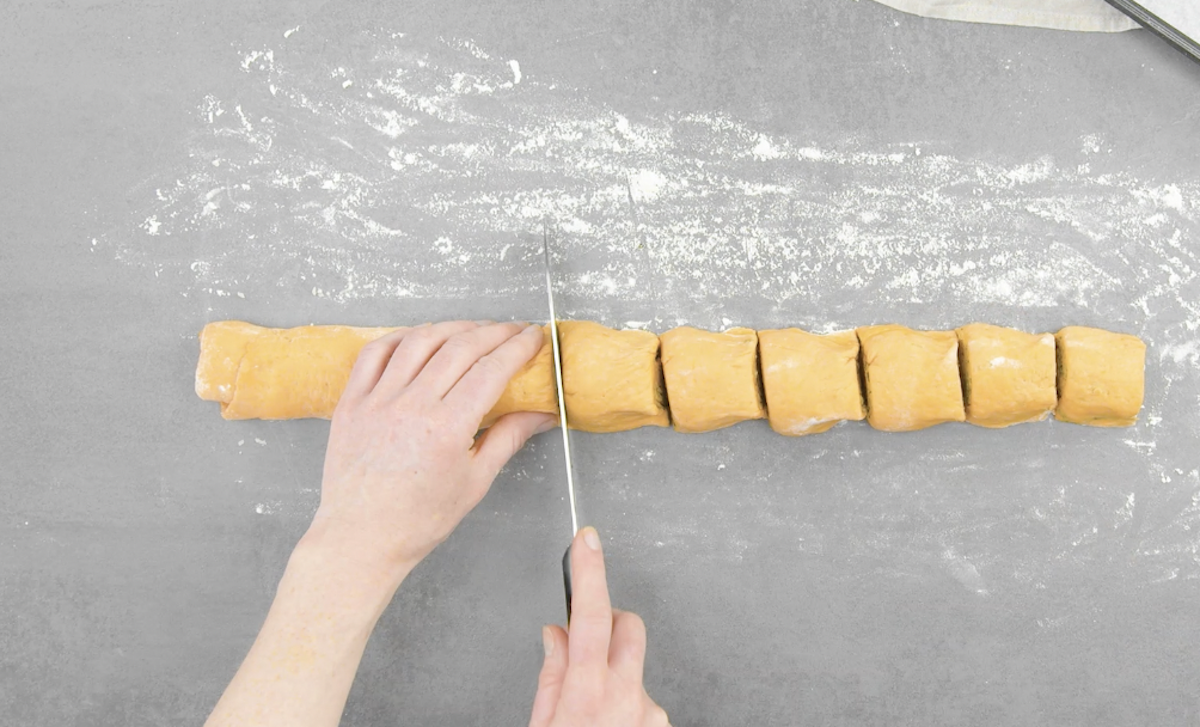1.4 Schneide die Teigrolle in ca. 5 cm breite Stücke und lass diese erneut abgedeckt für 40 Minuten gehen.