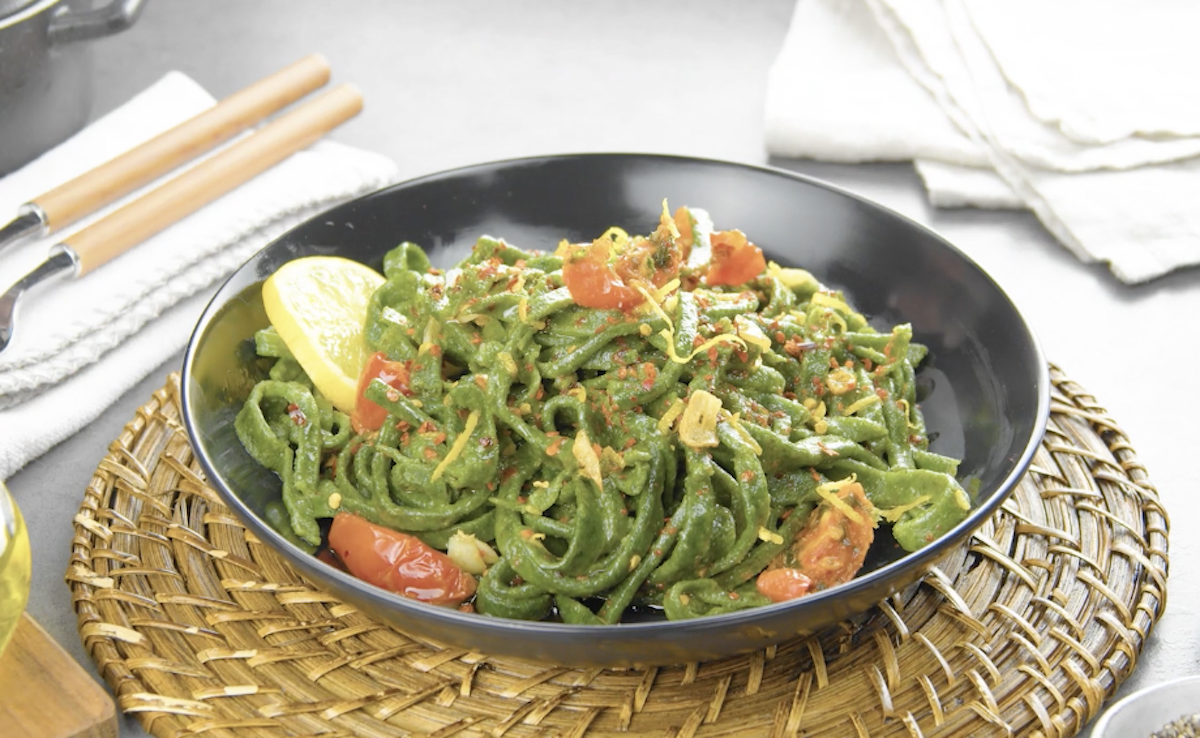 3.3 Serviere die Spinat-Pasta mit Chili-Knoblauch-Öl, getrockneten Tomaten und Zitronenzesten.