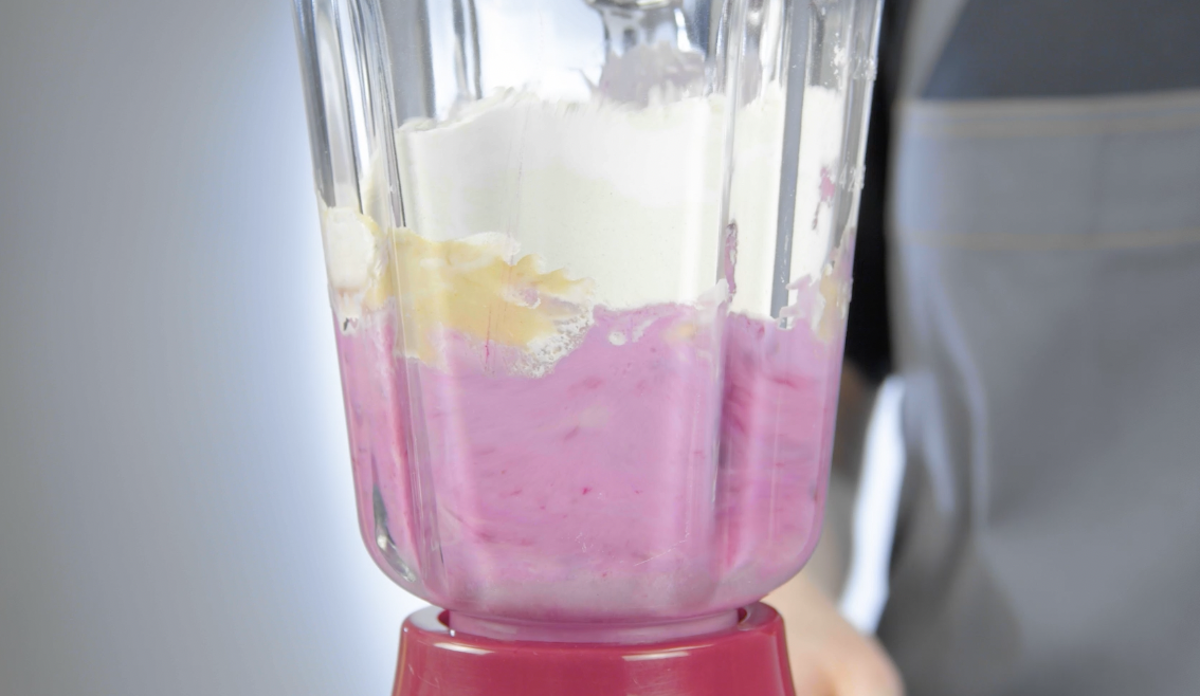 2.1 Püriere die gekochte Rote Bete in einem hohen Gefäß oder in einem Mixer mit Milch, Reisessig, Zucker, Lebensmittelfarbe, Frischkäse, Ei und Pflanzenöl.