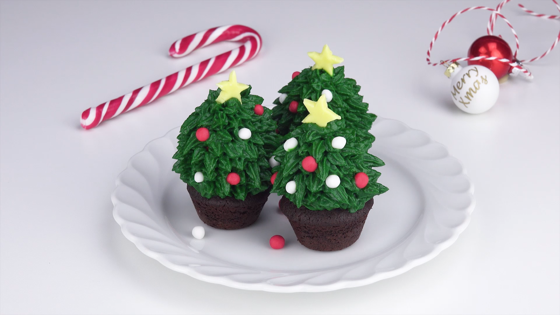 - Forme aus dem weißen und roten Fondant kleine Kugeln, von denen du mehrere auf die Weihnachtsbäume setzt. Drücke den gelben Fondant flach und schneide einen kleinen Stern daraus. Gelingt er nicht, kannst du den Fondant neu formen. Sobald du einen schönen Stern hast, kannst du diesen als Vorlage nutzen, auf den Fondant legen und um ihn herumschneiden. Alternativ kannst du Zuckerperlen mit einer Pinzette in die Creme setzen.