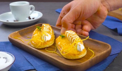 - Schneide den Blätterteig in acht ovale Stücke. Verquirle die Eigelbe und streiche die Stücke damit ein. Bedecke die Teiglinge mit Zitronencreme, backe sie für 15 Minuten bei 180 °C Umluft und lass sie anschließend abkühlen.