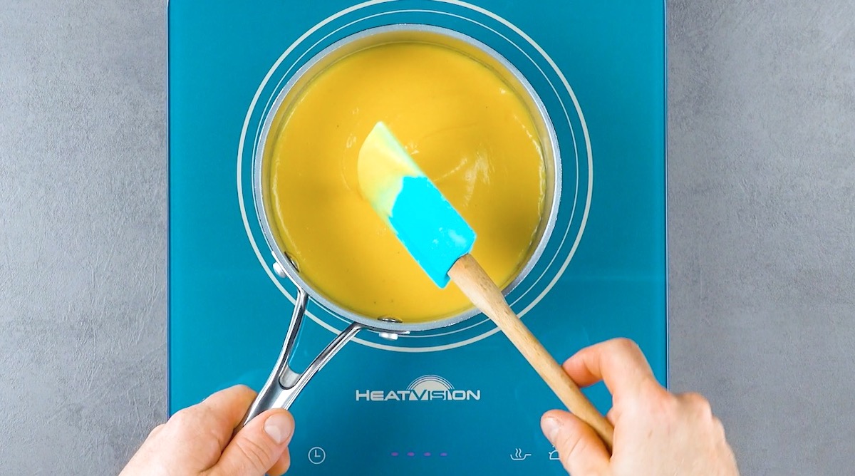 Koche die Ramen-Nudeln für 3 Minuten, lass sie dann abtropfen und etwas abkühlen. Zerlasse währenddessen Butter in einem Topf. Mische dann Mehl, Pfeffer, Milch und Cheddar hinzu und lass das Ganze unter Rühren aufkochen.