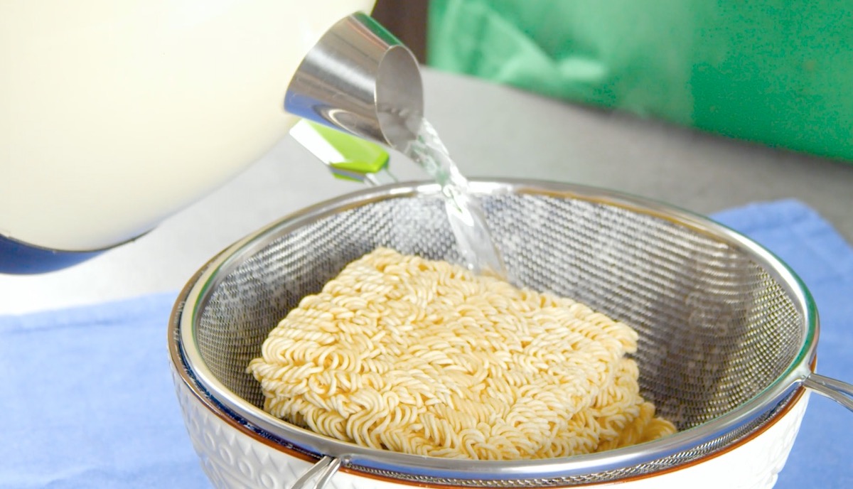 Übergieße die Ramen-Nudeln mit heißem Wasser und lass sie darin für 3 Minuten ziehen.