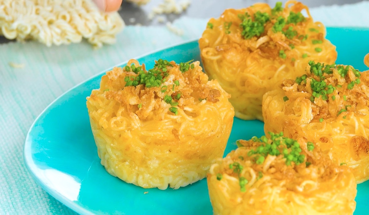 Teile die Ramen-Nudeln auf die Mulden einer eingefetteten Muffinform auf und bedecke sie mit Käsesoße. Backe die Ramen-Käse-Muffins für 20 Minuten bei 180 °C Umluft und serviere sie mit Röstzwiebeln sowie Schnittlauch. Dazu schmeckt Ketchup.