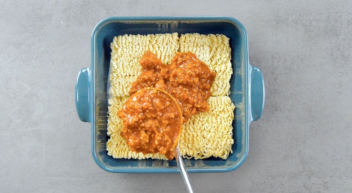 Fülle die Hälfte der Béchamelsoße in die Auflaufform. Halbiere die Ramen der Länge nach und lege die Hälfte davon auf die Béchamelsoße. Verteile dann die Hälfte der Sauce bolognese auf den Ramen.