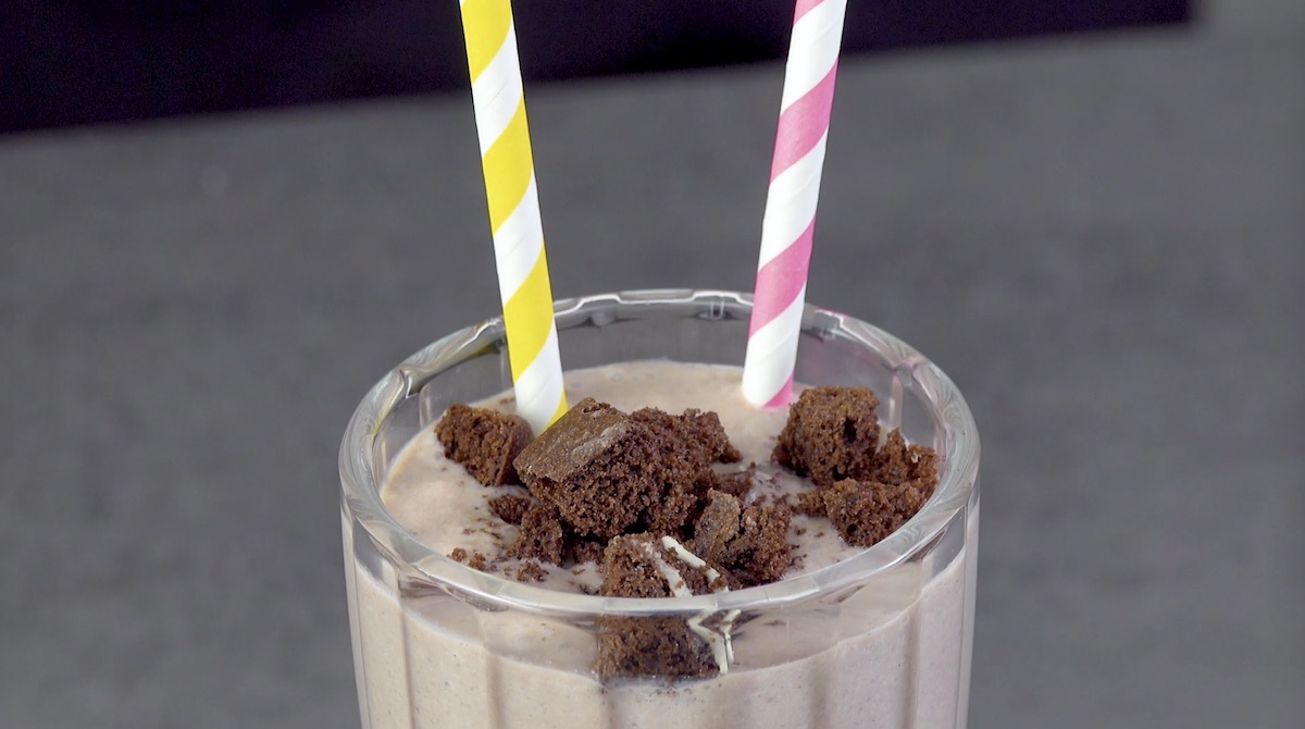 So geht es: Zerkrümele den Kuchen. Gib ihn dann zusammen mit Milch und Vanilleeis in einen Mixer. Dekoriere den Milchshake vor dem Servieren mit Kuchenkrümeln.